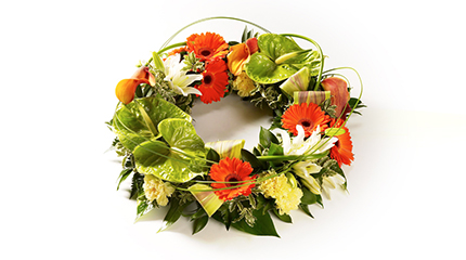 We’ve used brightly coloured orange gerbera, distinctive lime green anthurium, and mango calla lilies, partnered with cream asiatic lilies, lemon carnations and tropical foliage, to create this exotic and colourful wreath.