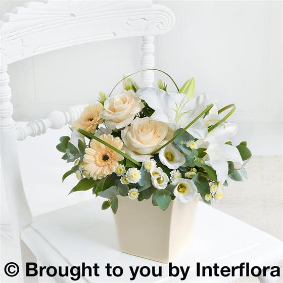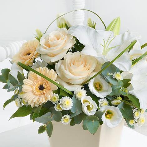 Featuring a white Oriental lily, 2 cream large headed roses, 2 peach germini, a white spray chrysanthemum and a white lisianthus with steel grass, eucalyptus and salal, arranged in a cream curved ceramic pot.