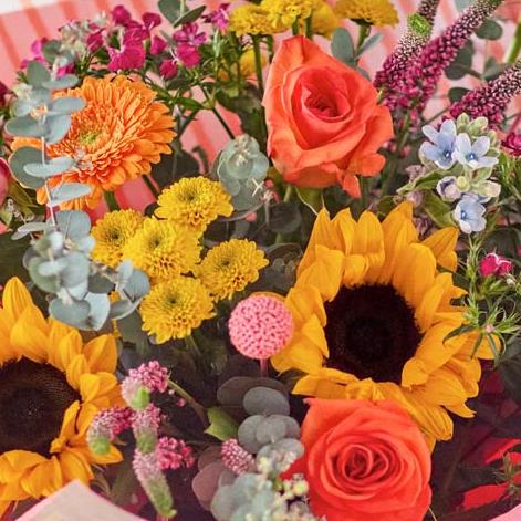 All the blazing colours of a carnivale (or a glowing sunset) captured in a gorgeous bouquet of the freshest blooms. Expect shades of cerise, saffron and tangerine with pops of blue. You might also see painted or dried foliage.