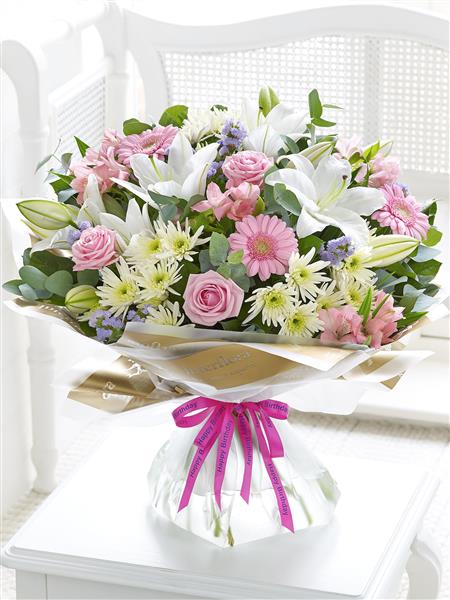 Featuring pink alstroemeria, white Oriental lily, pink large headed rose, white spray chrysanthemums, lilac statice and pink germini with eucalyptus and salal, wrapped and trimmed with ‘Happy Birthday’ ribbon and presented in Gift Packaging.