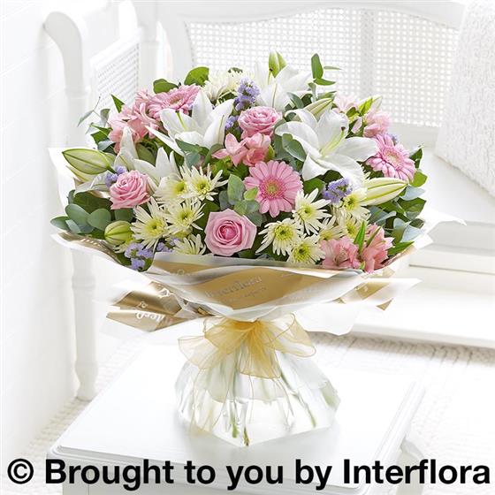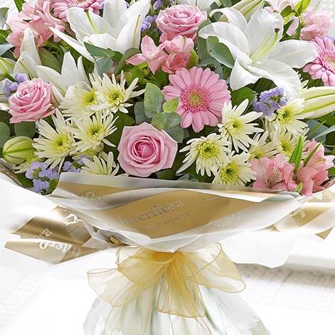 Featuring pink alstroemeria, white Oriental lily, long stemmed pink rose, white spray chrysanthemums, lilac statice and pink germini with eucalyptus, cinerea and salal, presented in gift packaging.