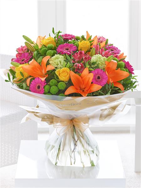 Someone is going to love this gift. The kaleidoscope of radiant colour ensures this striking hand-tied takes centre stage right away. With roses, lilies, carnations, chrysanthemums and so much more, this is certainly the right choice of gift to make an impression.