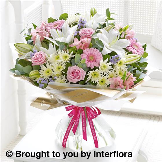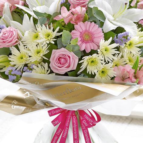 Featuring white Oriental lily, pink alstroemeria, pink medium-headed rose, white spray chrysanthemums and pink germini, hand-tied with lilac statice, eucalyptus and salal, finished with a pink Happy Grandparents' Day ribbon and presented in gift packaging.