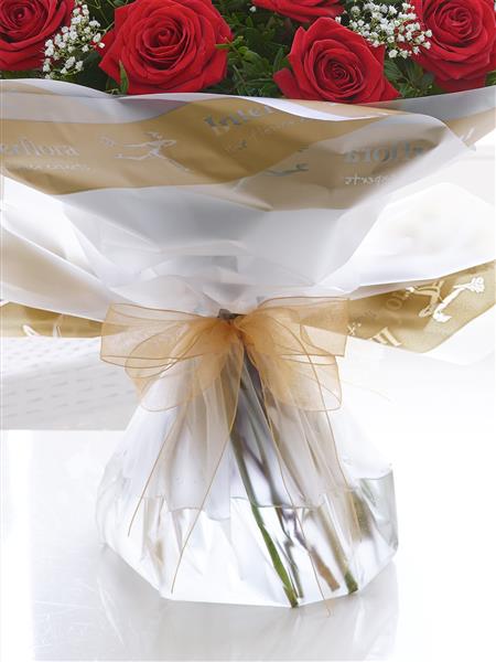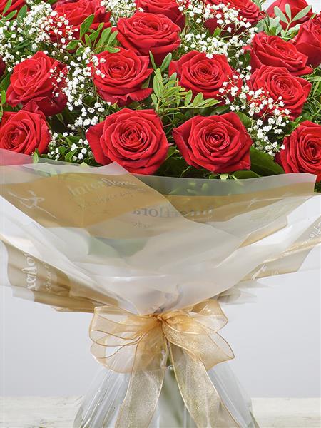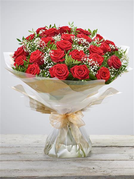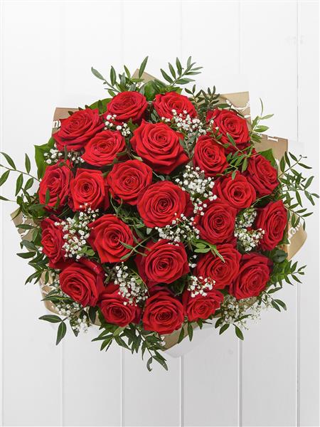 Featuring 24 large headed red roses handtied with gypsophila and salal, finished with gift wrap and ribbon.