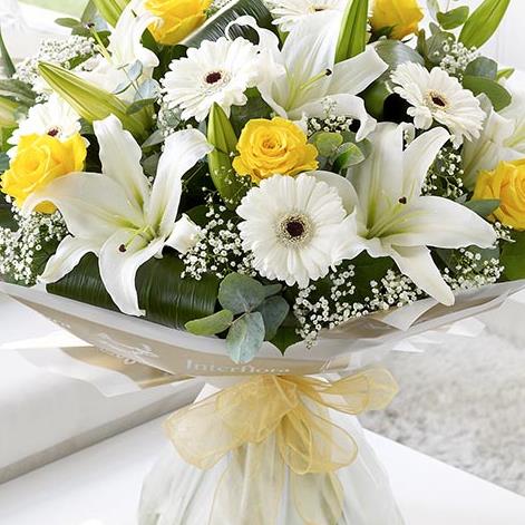 Featuring white germini with yellow large-headed roses and white Oriental lily, hand-tied with gypsophila, aspidistra leaf, salal and eucalyptus and finished with gift wrap and gold voile ribbon.
