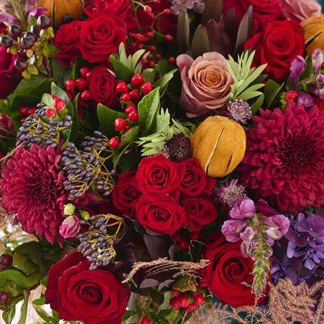 One of our larger Christmas bouquets this handcrafted marvel will feature a wonderful mix of luxurious flowers. It'll feature blooms in shades of red and green, with peach and cream highlights and pops of burgundy and cerise.