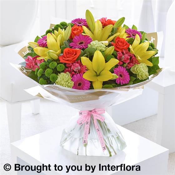 Someone is going to love this gift. The kaleidoscope of radiant colour ensures this striking hand-tied takes centre stage right away. With roses, lilies, carnations, chrysanthemums and so much more, this is certainly the right choice of gift to make an impression.