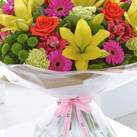 Featuring pink alstroemeria, green carnations, cerise germinis, yellow Asiatic lilies, orange large-headed roses and green spray chrysanthemums with pittosporum and salal, wrapped and trimmed with 'Happy Mother's Day' ribbon and presented in Gift Packaging.