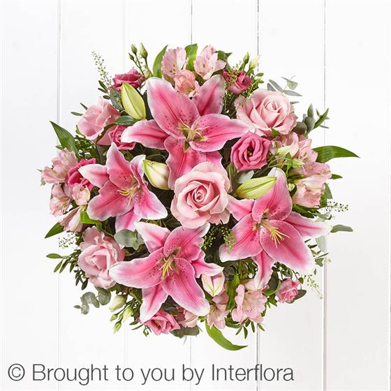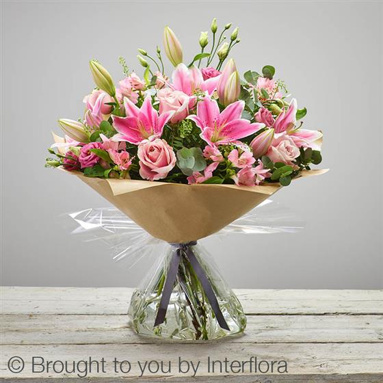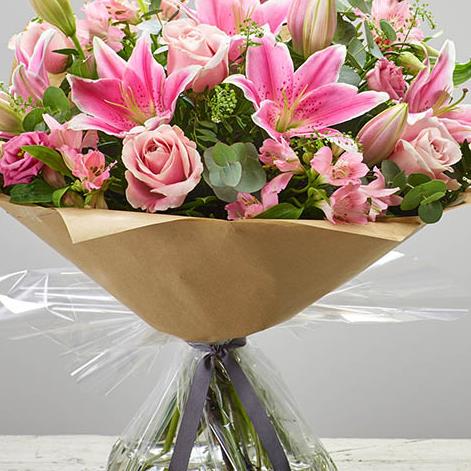 Featuring pink large headed roses, pink alstroemeria, pink oriental lilies, pink lisianthus and thlaspi, hand-tied with eucalyptus and pistache, finished with gift wrap and ribbon, presented in gift packaging.