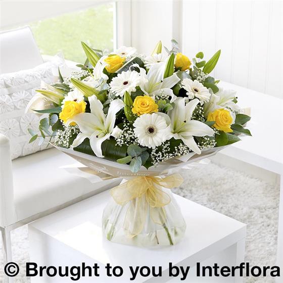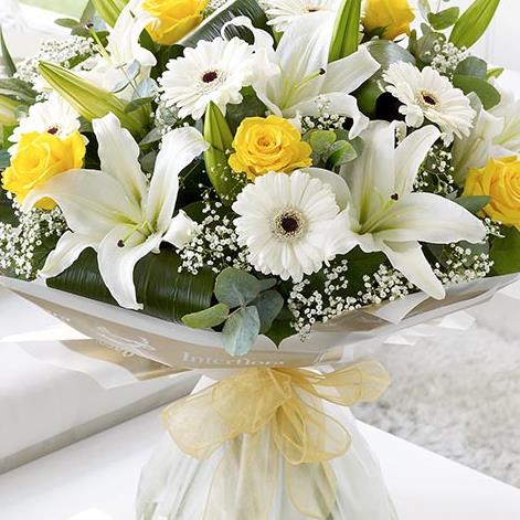 Featuring white germini, yellow large-headed roses, white Oriental lilies and white gypsophila, hand-tied with folded aspidistra leaves, eucalyptus and salal, wrapped and trimmed with gold voile ribbon.