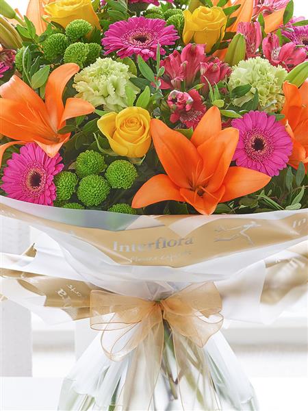 Featuring pink alstroemeria, green carnations, cerise germinis, yellow Asiatic lilies, orange large-headed roses and green spray chrysanthemums with pittosporum and salal, hand-tied, gift-wrapped and presented in Gift Packaging.