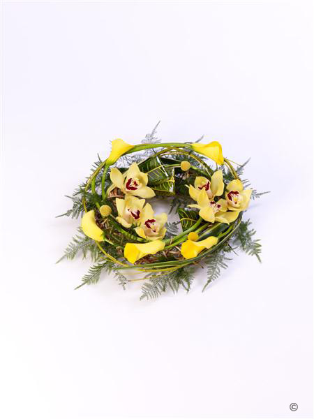 Yellow calla Lily and cymbidium orchids are entwined with cornus Stems, craspedia and asparagus fern around a circular willow frame to create this woodland wreath. Approximate diameter 60cm (23 inches).
