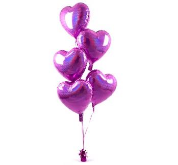 This eye-catching Pink Hearts balloon bouquet is radiant with an array of Pink metallic colours – just right for getting into the party mood. The heart 45cm micro-foil balloons arrive filled with helium and tied to a weight with curling ribbon decorations.