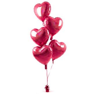 This eye-catching Red Heart balloon bouquet is radiant with an array of Red metallic colours – just right for getting into the party mood. The Heart 45cm micro-foil balloons arrive filled with helium and tied to a weight with curling ribbon decorations.