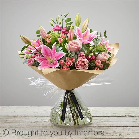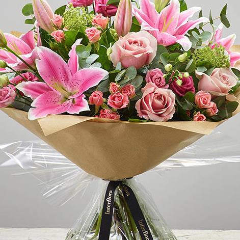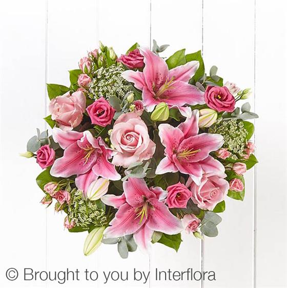 Featuring pink Oriental Lilies, Pink large-headed Roses, Pink Spray Roses, Pink Lisianthus and white Ammi, hand-tied with Eucalyptus and Salal and presented in Gift Packaging.