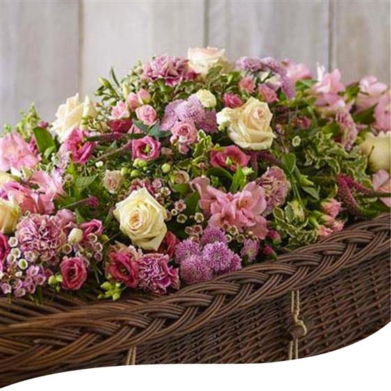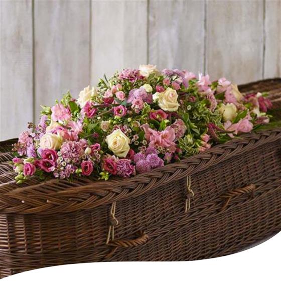 A flowing style of spray that covers the top of the casket with a profusion of blooms including lisianthus, alstroemeria, roses and chrysanthemums. This beautiful spray can also be deconstructed for friends and family to take home.