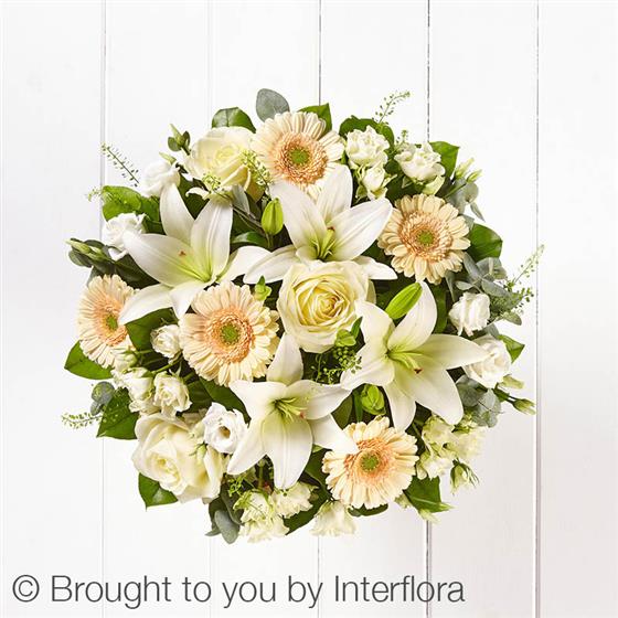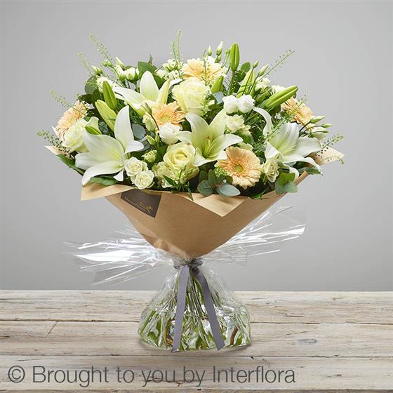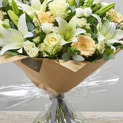 Featuring white LA lilies, ivory large headed roses, white lisianthus, white spray roses, cream germini and thlaspi green bell with eucalyptus and salal, hand-tied, gift-wrapped and presented in gift packaging.