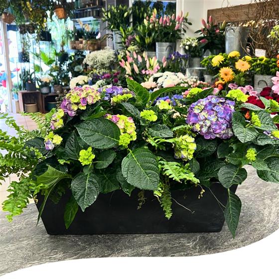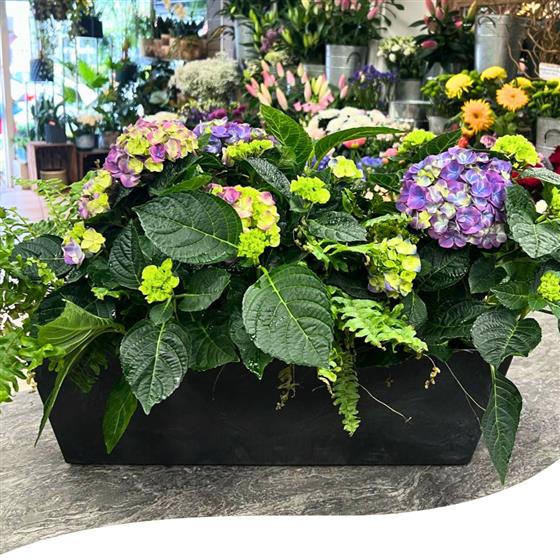 Introducing our Forest & Fuchsia Window Box, designed to enhance your home's exterior with seasonal summer charm. Each window box is carefully crafted, featuring a lush combination of seasonal plants that are stunning and strong enough to thrive in the summer heat. The included plant varieties are the Hydrangea Macrophylla and Fern.