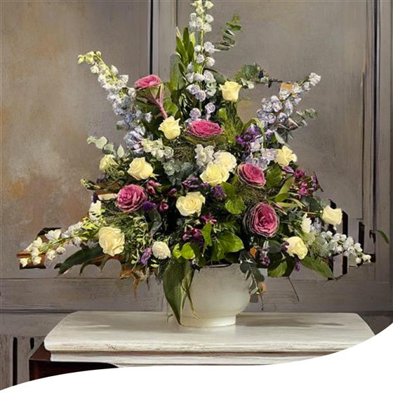 A beautiful arrangement made to face forwards only so it can go against a wall.