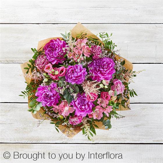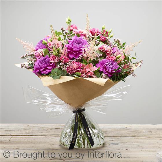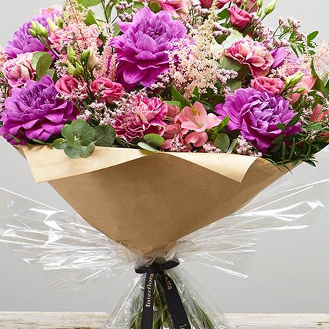 Fuchsia Cocktail is very popular and is the perfect blend of bright Purple and Pink flowers. Featuring pink alstroemeria, pink astilbe, pink/cream carnation, purple dahlia, pink limonium, pink lisianthus, eucalyptus & pistache, presented in gift packaging.