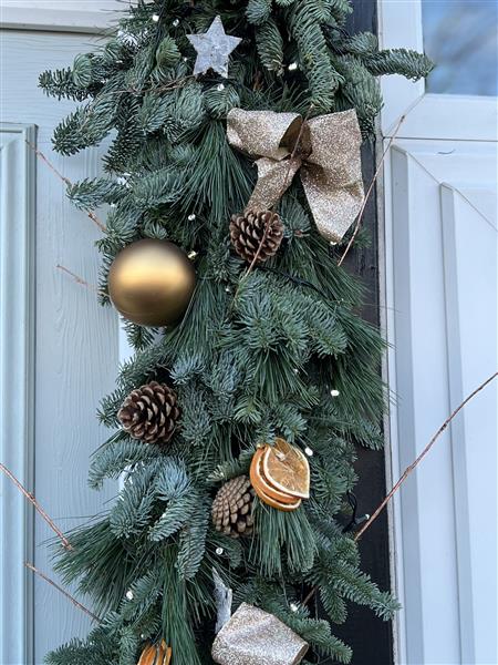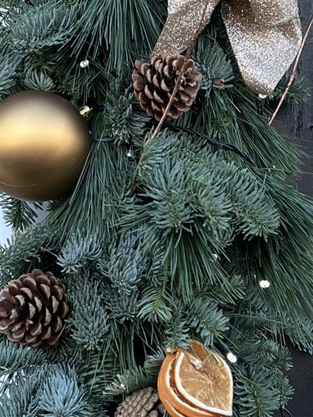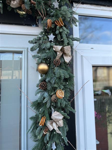 A large full mixed pine garland with all the decorations. We made this one with bright golds, Coppers and Natural dried fruits. A selection of twigs, Baubles, Clementines, Limes, Pine cones and Cinnamon twigs.