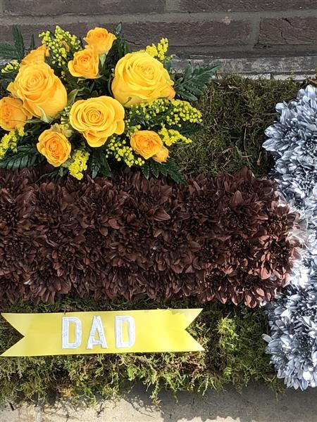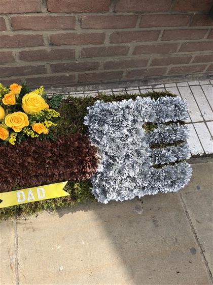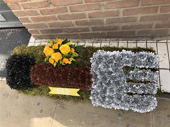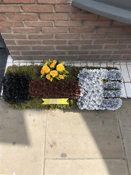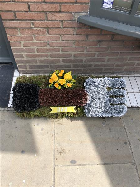 A Garden Fork Flower Tribute. We can change the colour of the ribbon and flower spray if required.