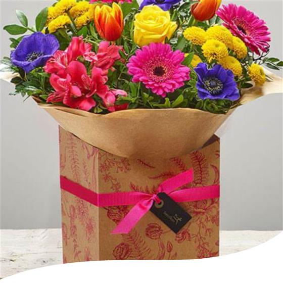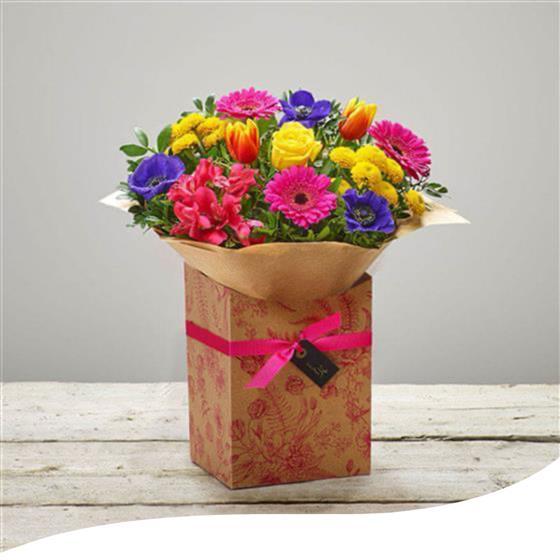 Featuring Blue Anemones, Red/Yellow Tulips, Yellow Large-Headed Roses, Cerise Alstroemeria, Yellow Spray Chrysanthemum and Cerise Germini, all adorned with Pistache and Sala. This beautiful arrangement is presented in an elegant gift box.