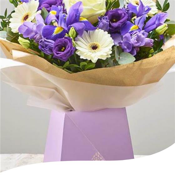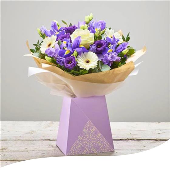 Introducing our Spring Amethyst Dusk bouquet, featuring a harmonious blend of Ivory Large-Headed Roses, Purple Freesia, White Germini, Purple Lisianthus, and Purple Phlox, complemented by Pistache and Eucalyptus for a delightful touch and captivating fragrance. Perfect for any occasion, be it a birthday, anniversary or a simple gesture to show someone you care. Presented in an elegant gift box, this bouquet is an ideal gift for your loved ones.