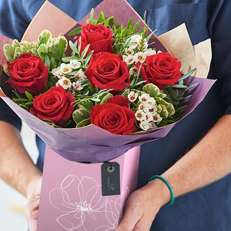 Each design we create is a unique masterpiece skilfully crafted by our talented florists. Using the freshest stems available each day, your flower arrangement will feature the same colour palette as displayed in the image, including 6 Red Roses, expertly arranged and perfectly presented in a pretty gift box.