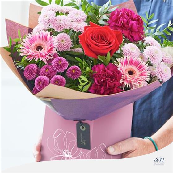 Meet our Valentine's Pink Passion Gift Box, a unique masterpiece skilfully crafted by our talented florists. Utilising the freshest stems available each day, your hand-tied bouquet will showcase the same colour palette as displayed in the image. While it may vary slightly from the pictured arrangement, rest assured it will maintain the same level of exquisite beauty.