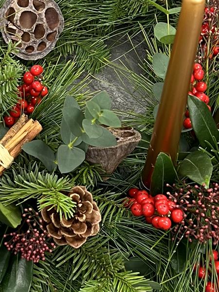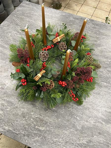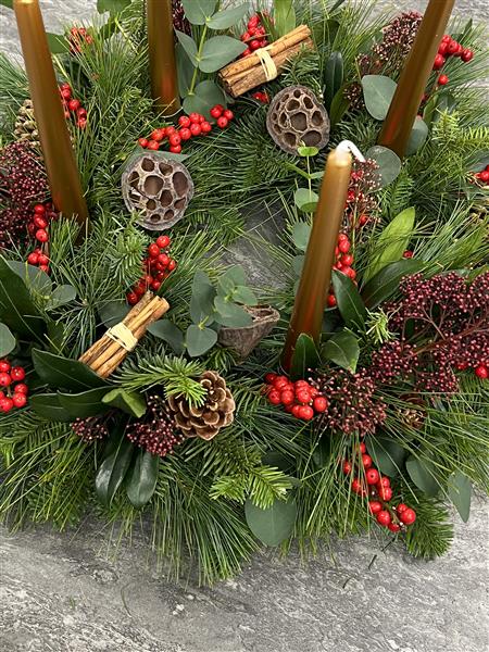 A hand made fresh Advent wreath with Gold Candles, Mixed Pines, Firs and Berries.