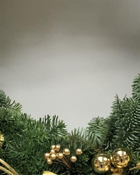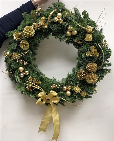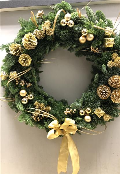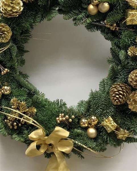 A blue pine door wreath made using different types of gold decorations. We will make a door wreath as similar to the picture using different Christmas decorations sticking to the Gold Theme.