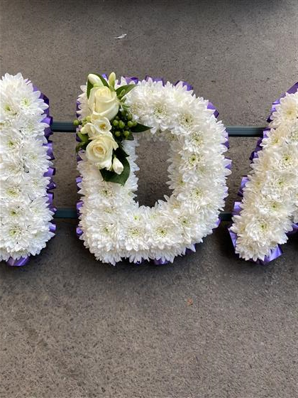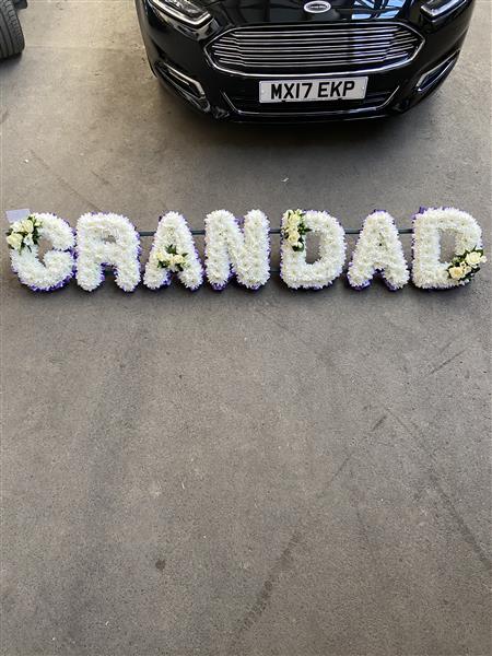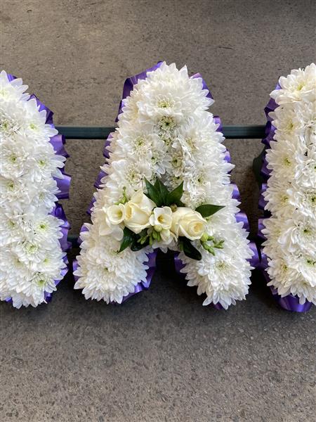 A Grandad Tribute - White Chrysanthemums, Purple Ribbon edge and White Rose Sprays.