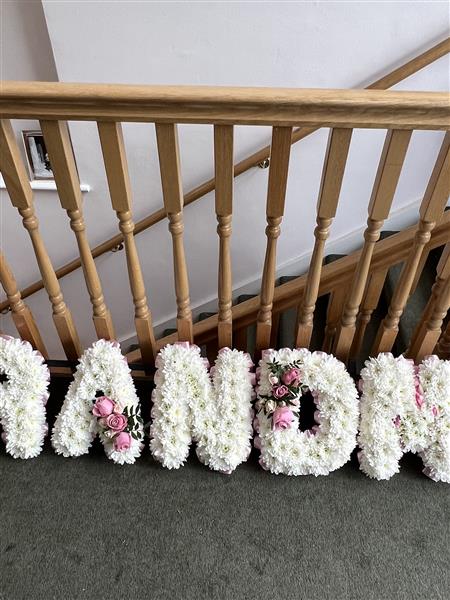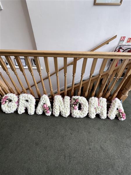 A grandma tribute made with chrysanthemum base. Ribbon surrounds can be customised to any colour preference. The sprays on the flowers can be matched and adjusted to the ribbon colour or your preference.