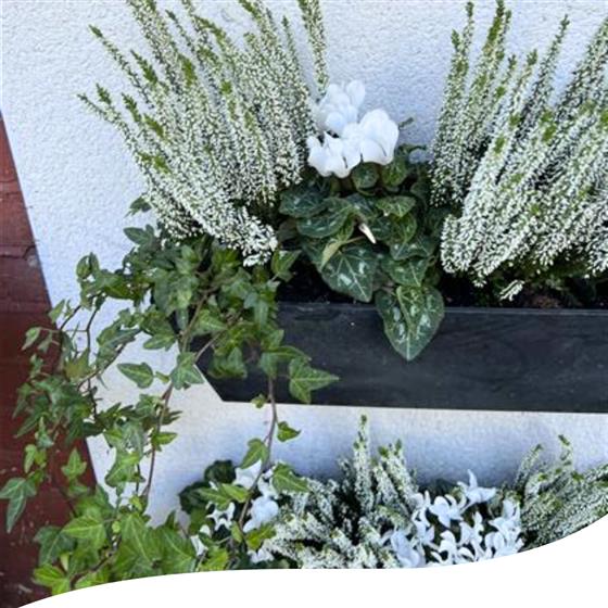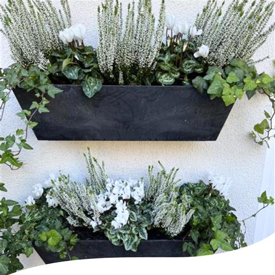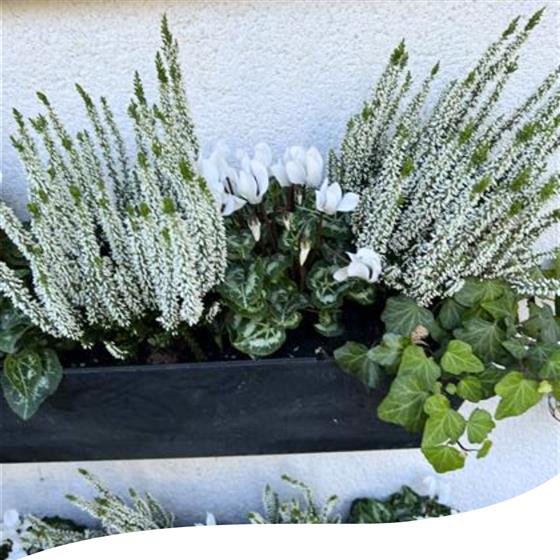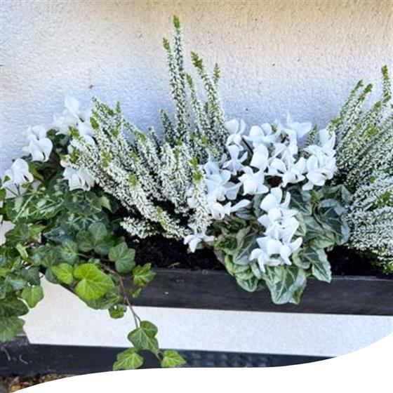 Each window box is planted with a lush combination of seasonal flowers and plants that not only look stunning but thrive through the summer heat. The seasonal plant varieties for our Green & Pearl Window Box include Heather, Cyclamen, and Trailing Ivy.