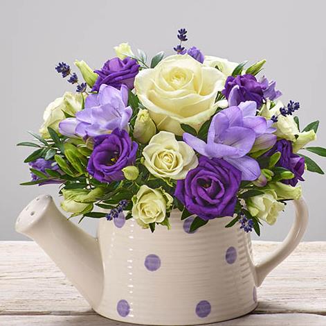 Featuring an ivory large headed rose, purple freesia, purple lisianthus, white spray roses, dried lavender and pistache, beautifully arranged in a spotted ceramic watering can.