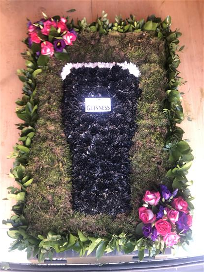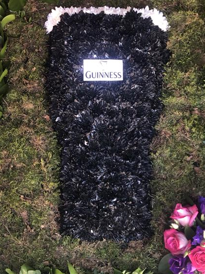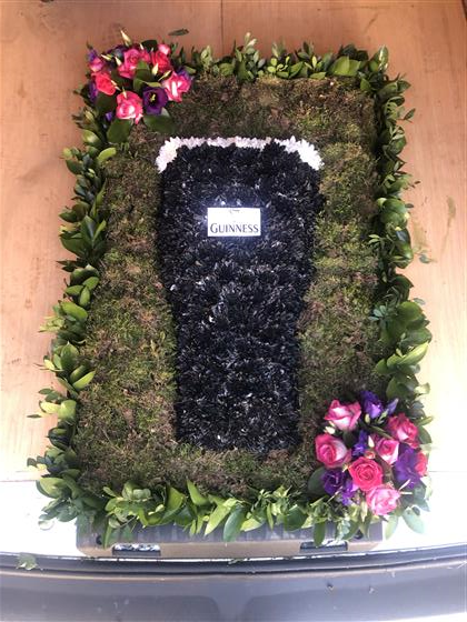 A 3 x 2 Guiness floral tribute with coloured flower sprays in each corner.We have designed this to look lovely but also be straight to the pint.