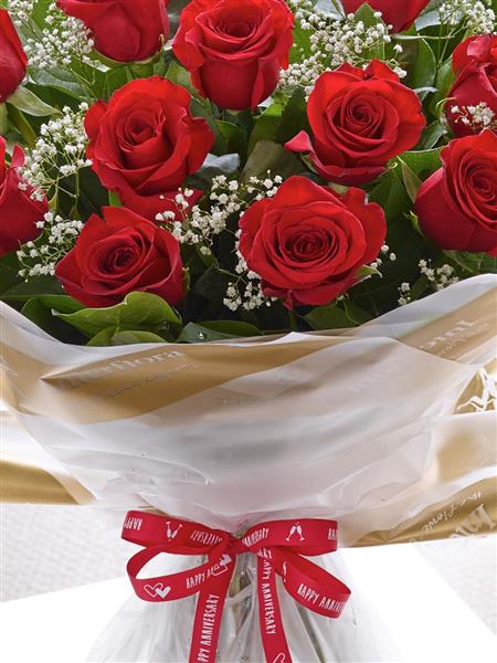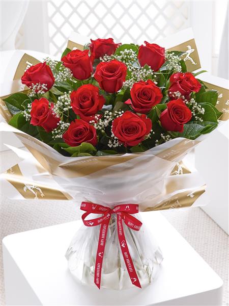 Featuring large-headed red roses hand-tied with gypsophila and salal. Trimmed with a Anniversary ribbon and presented in Gift Packaging.