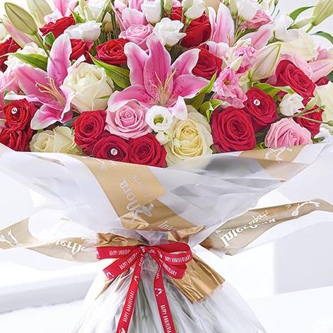 Featuring 25 red Naomi large headed roses, 10 pink large headed roses, 10 ivory large headed roses, 5 pink lisianthus, 5 white lisianthus and 5 pink Oriental lilies with dracaena and salal, finished with 10 long diamante pins. wrapped and trimmed with an 'Anniversary' ribbon.