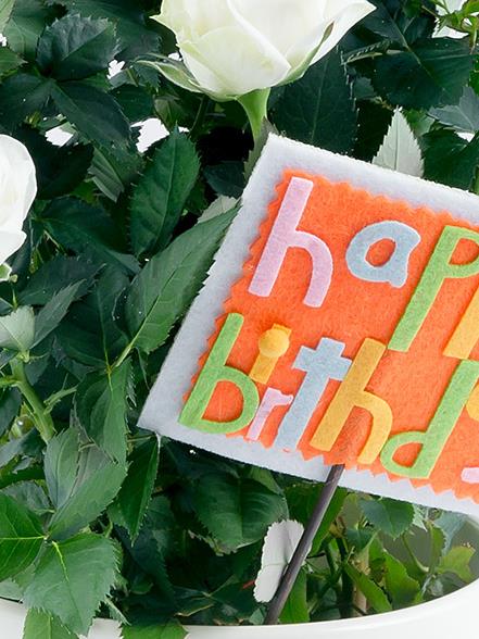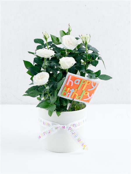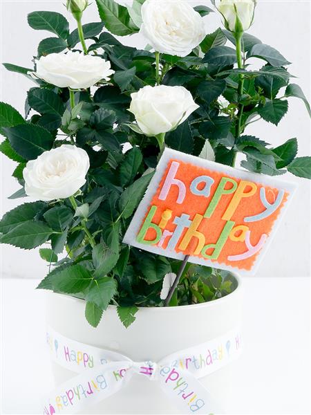 Featuring a cream rose plant presented in a white ceramic pot with birthday ribbon and a ‘Happy Birthday’ pick.