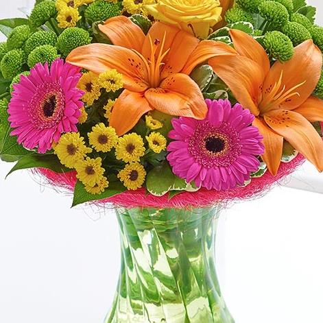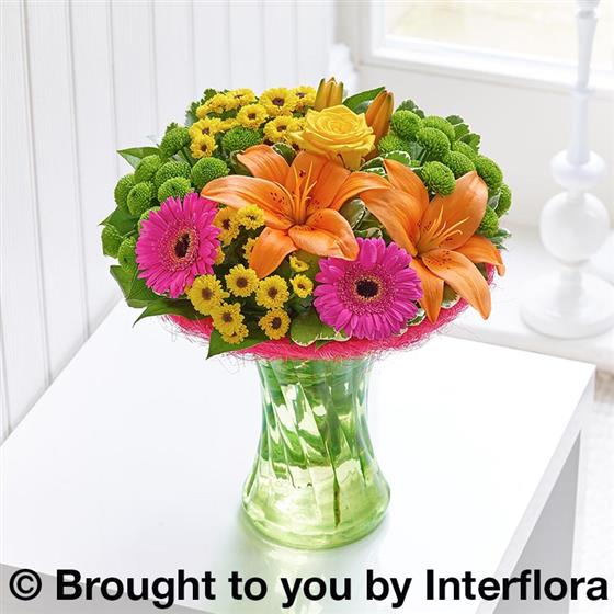 Featuring 2 cerise germini, 1 yellow large-headed rose, 2 green chrysanthemums, 1 orange Asiatic lily and 2 yellow tanacetum with salal, in a lime curved glass vase with a vibrant sisal collar and finished with a ‘Happy Birthday’ ribbon and presented in Interflora Gift Packaging.