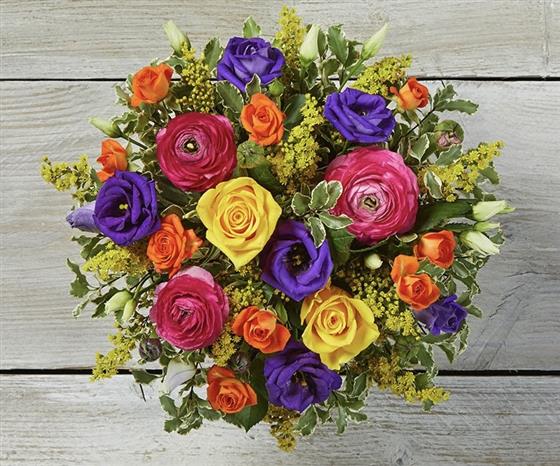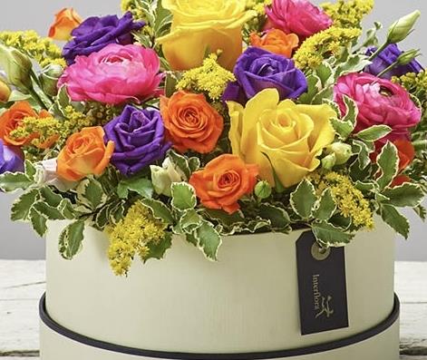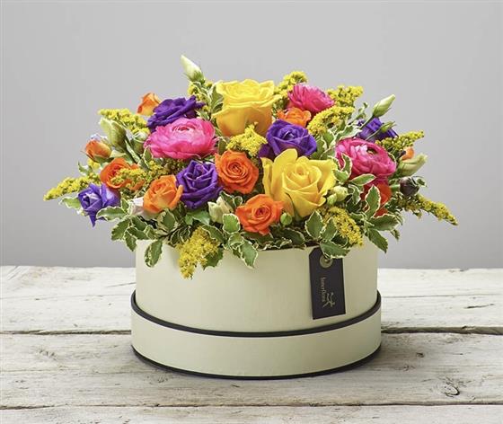 Featuring Yellow Large Headed Roses, Purple Lisianthus, Orange Spray Roses, Cerise Ranunculus and Yellow Solidago, accented with Pittosporum. Presented in a soft cream and black hatbox for a touch of elegance.