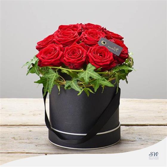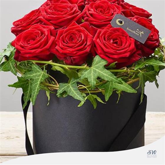 Introducing our Crimson Rose Hatbox – a stunning display of Red Large-Headed Roses delicately arranged with variegated Ivy and Pistache. This elegant arrangement is presented in a tall black and cream hatbox, adding a touch of sophistication.