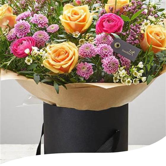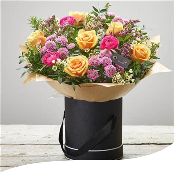 Our expertly crafted bouquet is composed of the finest blooms, including Peach Large-Headed Roses, Pink Spray Chrysanthemums, Pink Limonium, Cerise Ranunculus and White Waxflower. These flowers are artfully arranged in a tall Black Hatbox, creating a visually stunning display that will take your breath away.