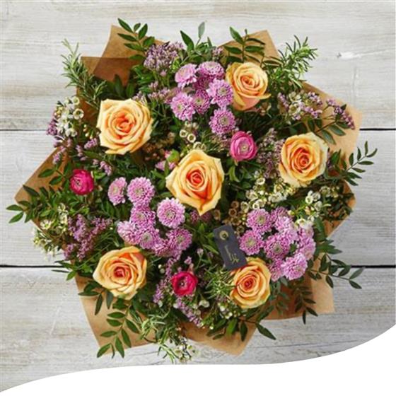 The addition of Pistache, Salal and Rosemary adds a unique touch to this already beautiful bouquet. The fragrant Rosemary and delicate Waxflower provide a delightful aroma that will fill the room, while the vibrant colours of the Roses and Ranunculus are sure to put a smile on anyone's face.