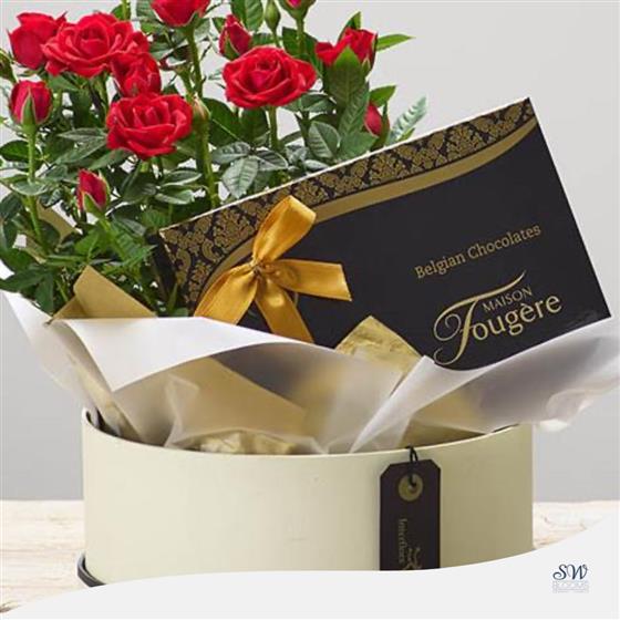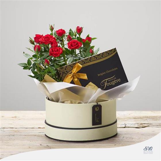 This enchanting ensemble features a vibrant Red Rose Plant, a symbol of enduring passion and a box of delectable chocolates nestled within a stylish soft cream and black hatbox. The velvety petals of the Red Rose harmonise with the rich flavours of the chocolates, creating a perfect symphony of romance and indulgence.