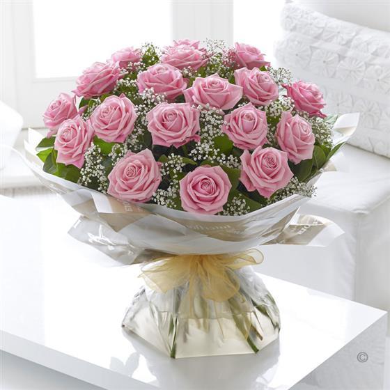 Featuring 18 large-headed pink roses hand-tied with gypsophila and salal leaves, and finished with gift wrap and ribbon.