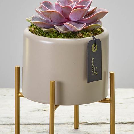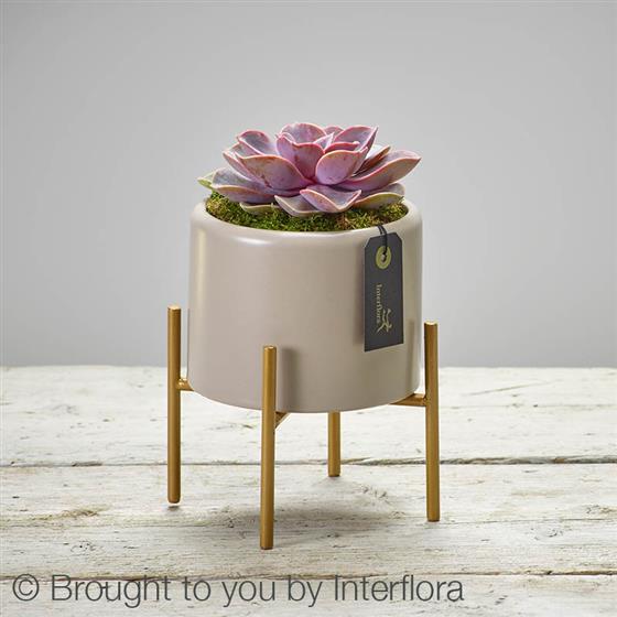 Featuring a pink echevaria planted in a stylish sandy coloured ceramic with feet.