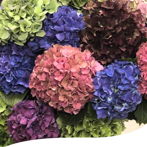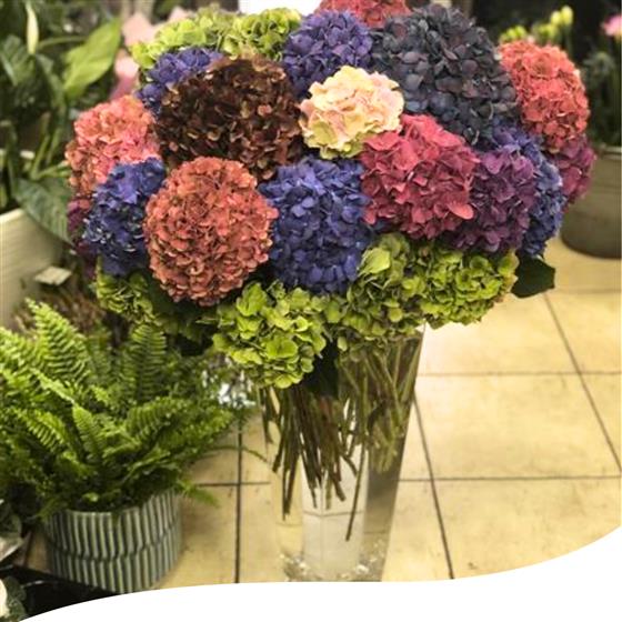 Experience the beauty of our 35 Mixed Large-Headed Hydrangeas, expertly arranged in a tall vase. For an extra touch of luxury, opt for the version with additional foliage, showcasing tall Eucalyptus and Palm leaves.