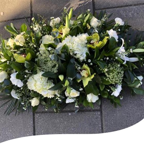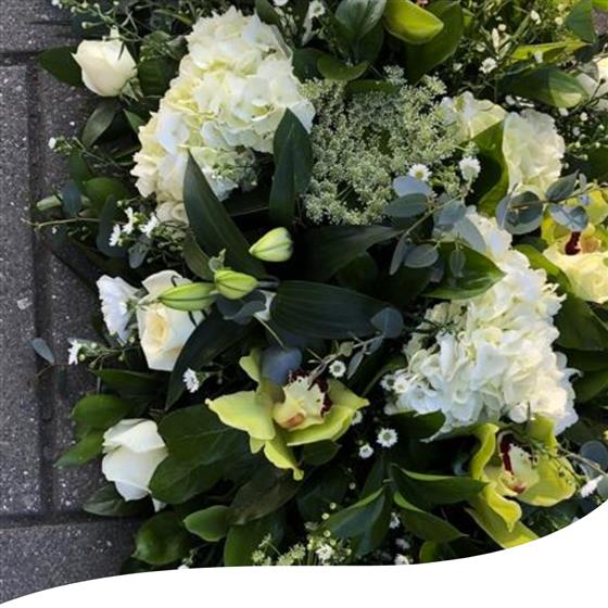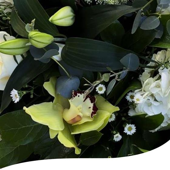 A Cymbidium Orchid Spray in Green and White. Including Large Headed Roses, White Hydrnngeas, White Aster and White Carnations. Choice foliage throughout. In this spray we use mixed foliage like palms, Aspidistra leaves, Ruscus, Salal and Eucalytpus.